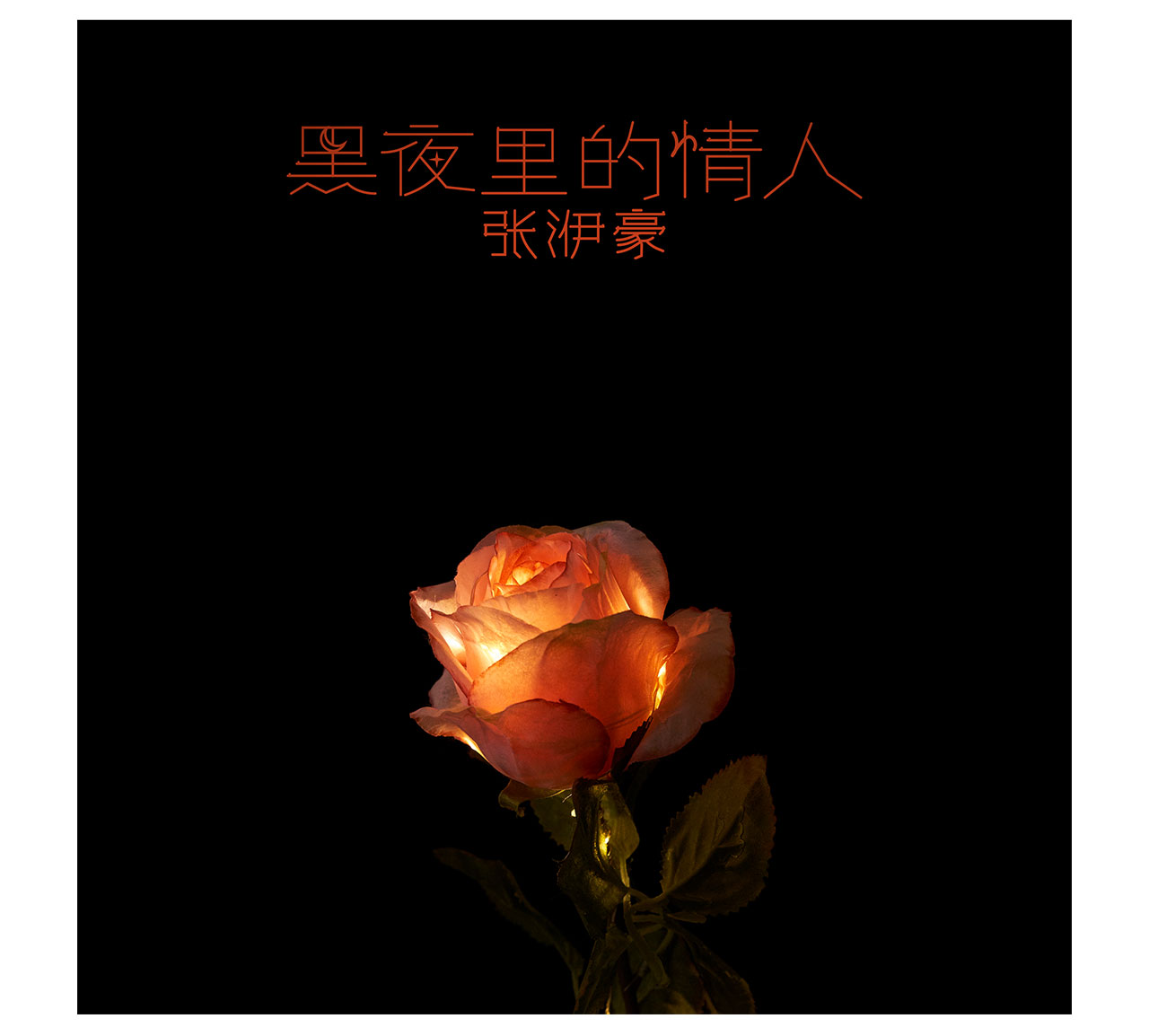 纯黑底搭配暖橙光调色,让发光玫瑰成为视觉核心,隐喻深夜克制的爱意。同色系镂空细字体设计呼应光感,极简文字排版,让浪漫更内敛,贴合专辑温柔基调