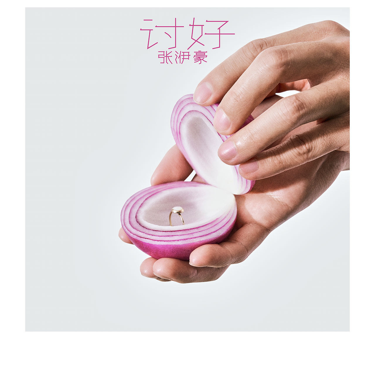 与摄影师沟通 “洋葱藏戒指” 核心意象,搭配粉紫调调色呼应画面,纤细线条字体设计贴合温柔质感,纯白背景下文字精准排版,让这份笨拙爱意的隐喻更聚焦。