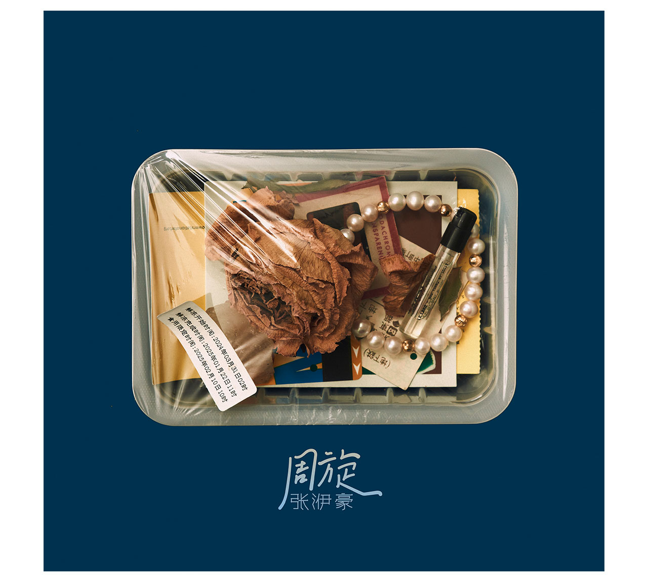 藏蓝调调色强化保鲜盒封存旧物的氛围感,干枯玫瑰等细节暗喻情绪拉扯。软手写字体设计贴合歌名纠结感,文字轻量排版,让内向者的心事具象又克制