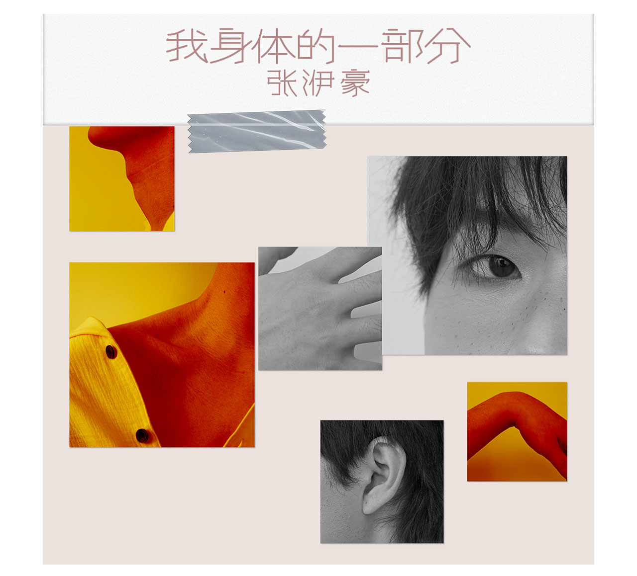 和摄影师配合拆解身体局部,暖橙与黑白撞色调色拼贴自我,呼应 “不完整才真实” 内核。胶带小设计联动主封面,裸粉色细字体设计温柔点题,文字简约排版更显细腻